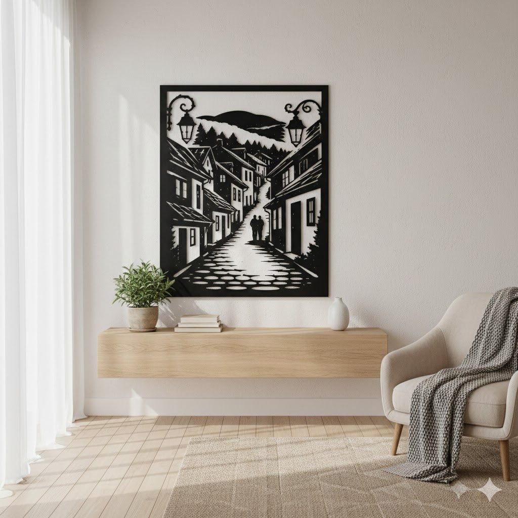 Tamo gdje svaki korak čuva uspomenu." 🏮🏘️ Ova unikatna metalna dekoracija unosi duh Kalesije i njenih mahala direktno u vaš dom. Detaljan prikaz tradicionalne arhitekture i uličnih fenjera koji bdiju nad prolaznicima stvara osjećaj sigurnosti, mira i pripadnosti. Savršen komad za sve koji nose rodni kraj u srcu, pretvarajući vaš zid u galeriju koja slavi historiju i ljepotu sjeveroistočne Bosne.