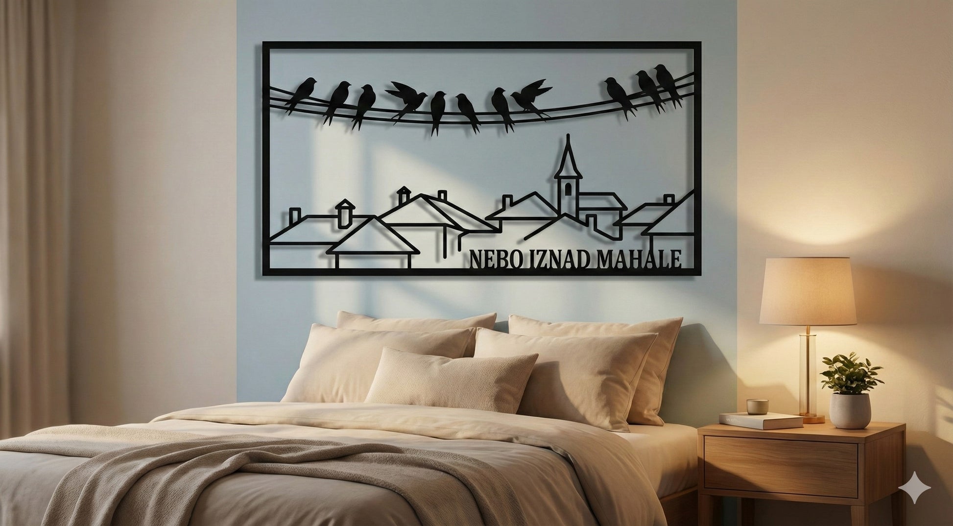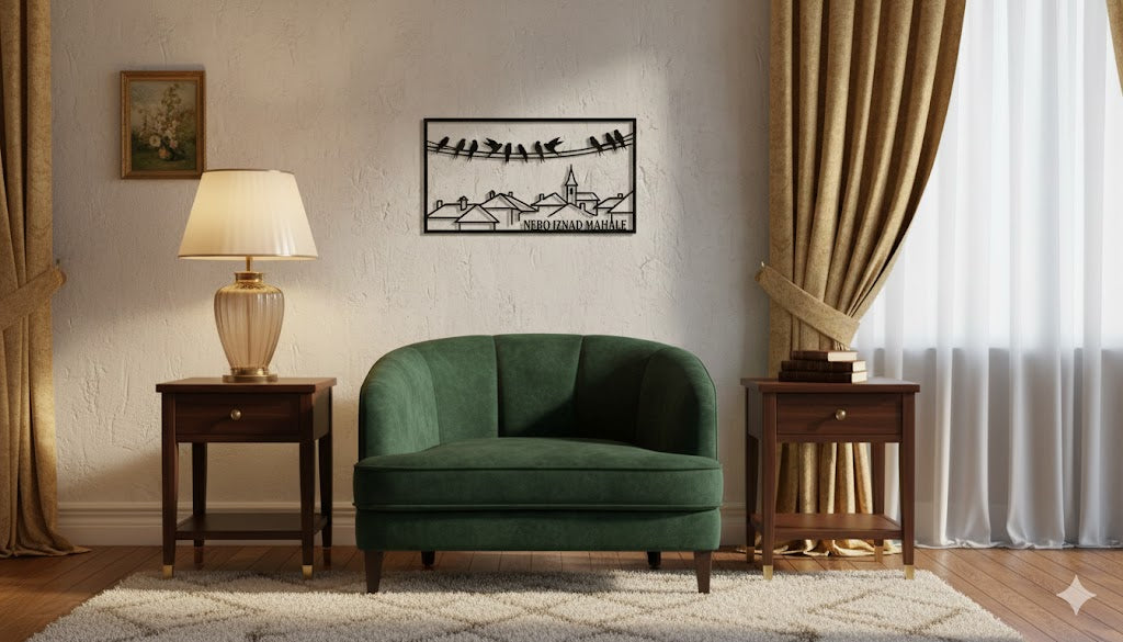 Tamo gdje se nebo spaja sa krovovima djetinjstva." 🐦🏠 Ova unikatna metalna dekoracija unosi mir i dušu bosanske mahale u vaš dom. Siluete ptica koje bezbrižno odmaraju na žicama iznad prepoznatljivih krovova i munare stvaraju dirljiv prizor koji odiše toplinom i spokojem. Idealan komad za spavaće ili dnevne sobe, donoseći umjetnički dodir koji priča priču o slobodi i tradiciji.