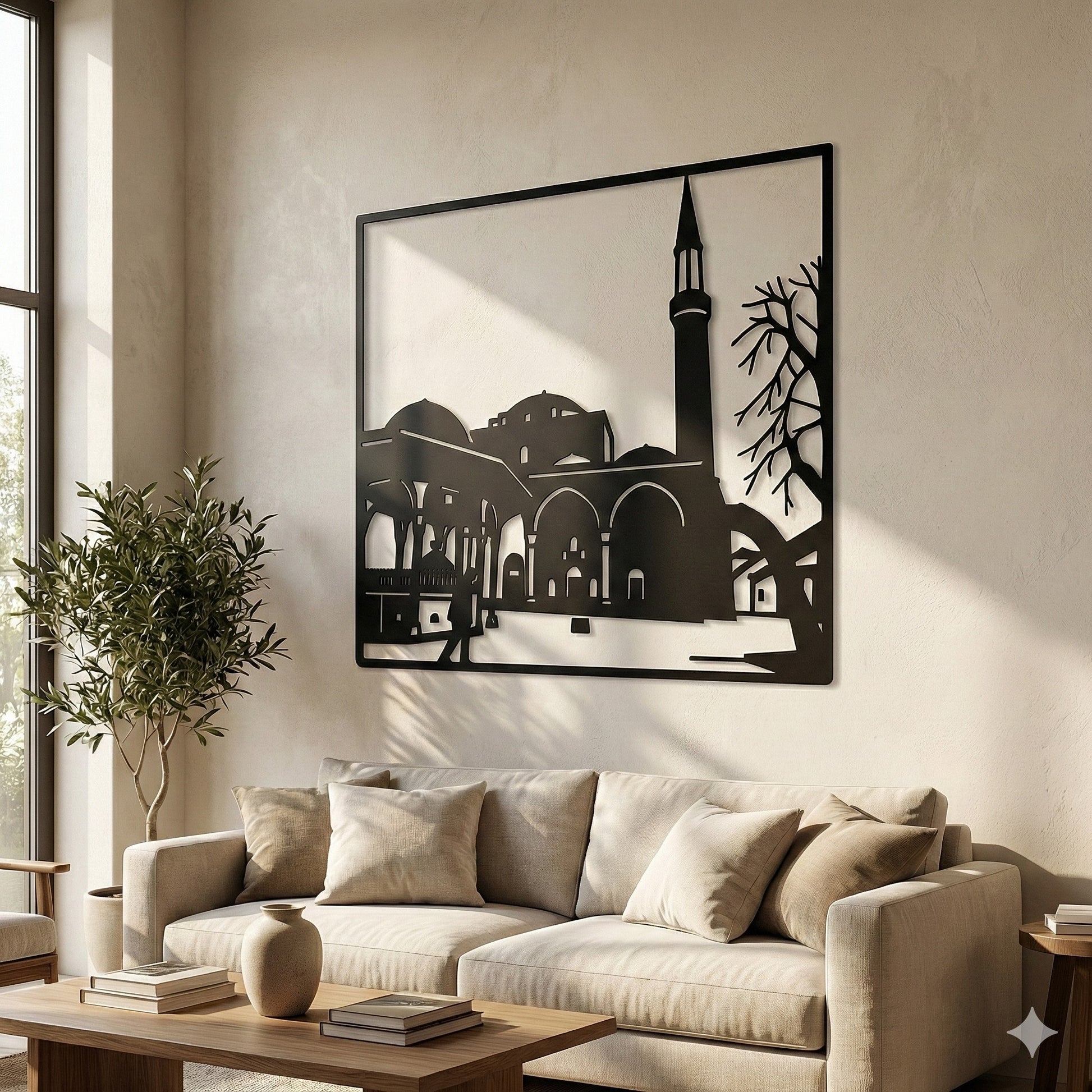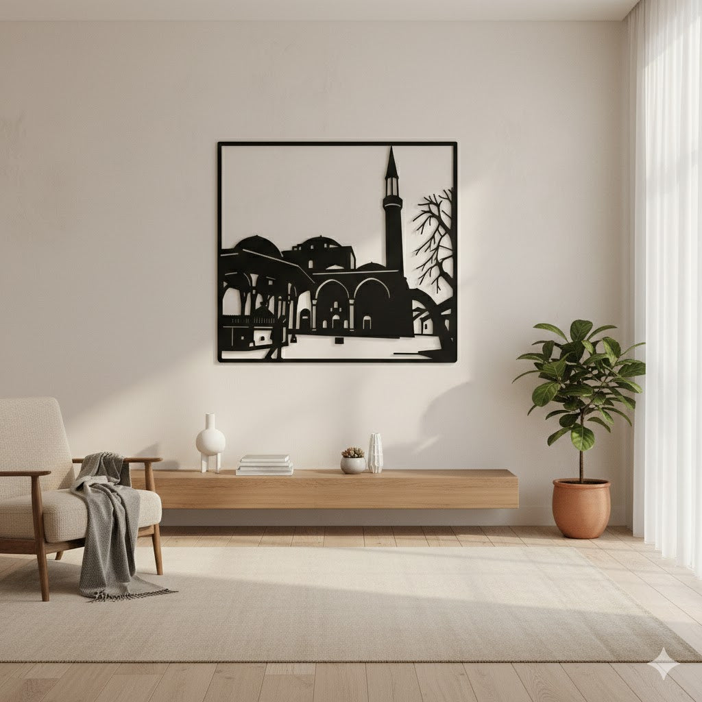 Duhovna snaga uklesana u metalu." ✨🕌 Gazi Husrev-begova džamija je vijekovima simbol Sarajeva i nezaobilazna tačka svakog putnika. Ova unikatna metalna dekoracija donosi umjetnički prikaz Begove džamije, hvatajući eleganciju njenih lukova i prepoznatljivu siluetu munare. Savršen je izbor za sve koji žele unijeti dozu historije, duhovnosti i sarajevskog šarma u svoj dom ili poslovni prostor.