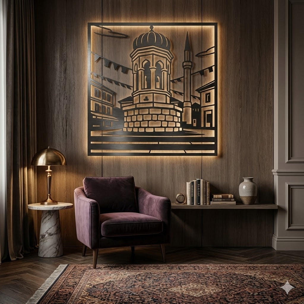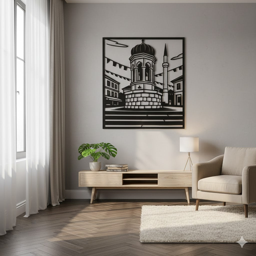 Simbol grada soli i neraskidivih prijateljstava." ⛲🏙️ Tuzlanska česma nije samo arhitektonski biser, već mjesto gdje kuca srce grada. Ova unikatna metalna dekoracija precizno prenosi siluetu česme sa Trga slobode, uokvirenu obrisima obližnje munare i krovova, unoseći u vaš dom atmosferu tuzlanske topline i tradicije. Savršen poklon za svakog Tuzlaka i Tuzlanku, kao i za sve ljubitelje bosanskohercegovačke baštine.