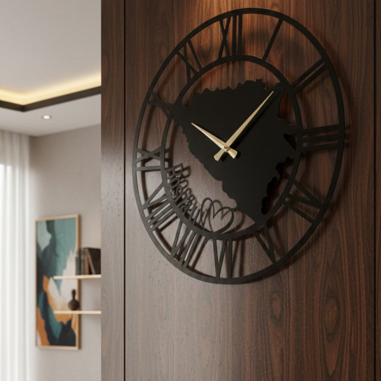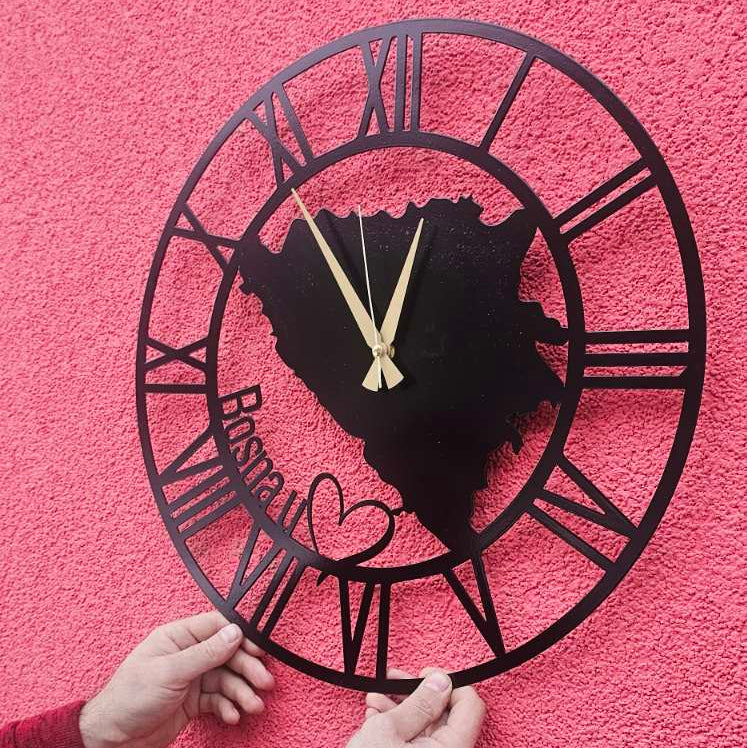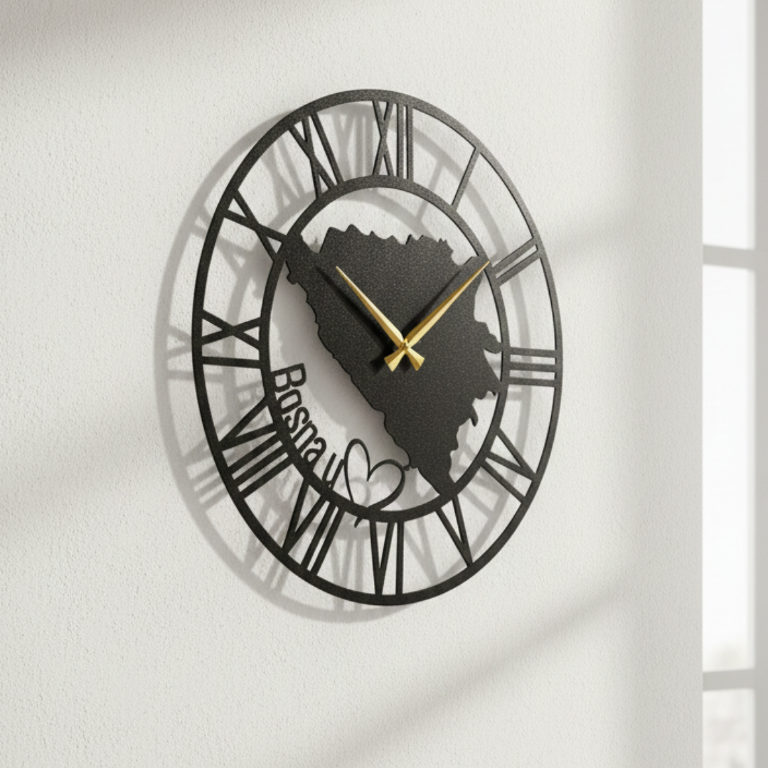 Unesite dašak elegancije i ljubavi prema domovini u svoj dnevni boravak, kancelariju ili hodnik. Naš unikatni metalni sat model "Bosna" dizajniran je za one koji cijene vrhunsku estetiku i kvalitet bez kompromisa.