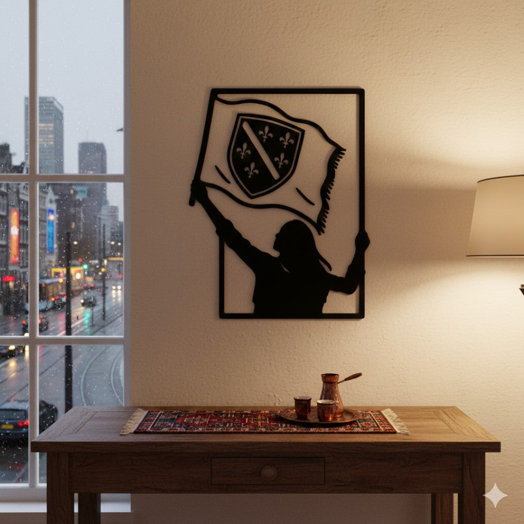 Jedna si jedina..." ⚜️ Ona je simbol snage, ponosa i neizmjerne ljubavi prema domovini. Ova prelijepa silueta djevojke koja visoko podiže zastavu sa ljiljanima savršen je podsjetnik na korijene i identitet. Unesite duh Bosne u svoj dom ili poklonite ovu emociju nekome posebnom.